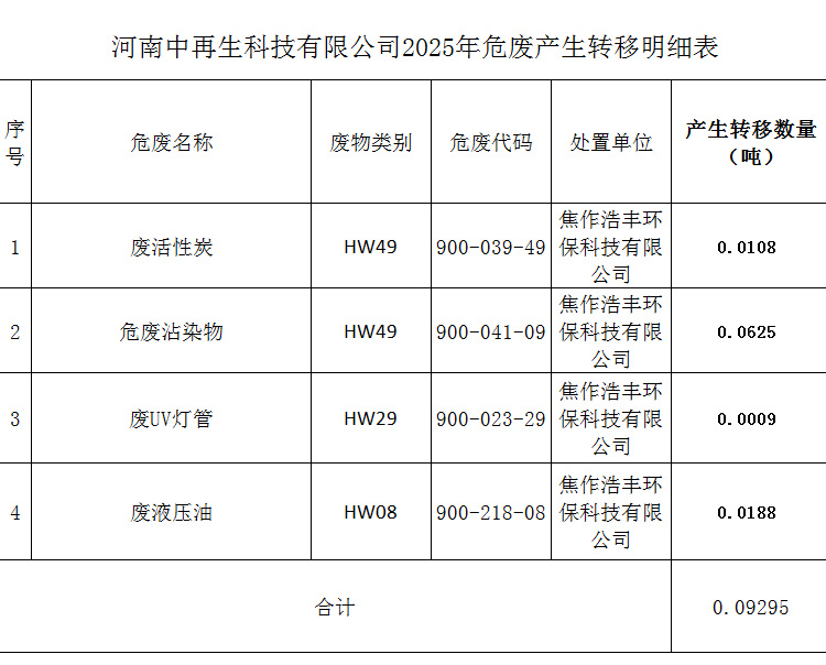 河南中再生科技有限公司2025年危廢情況公示